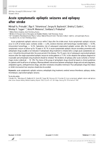 Prokudin MYu, Tikhomirova OV, Bazilevich SN, Dyskin DE, Tsygan NV, Moiseeva AM, Prokudina SS. Acute symptomatic epileptic seizures and epilepsy